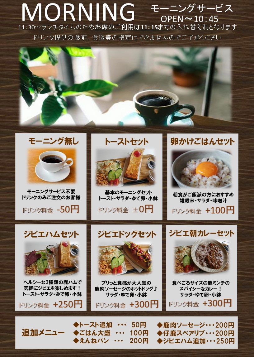 通常のモーニングとジビエのオプションが付いた豊富なモーニングをご用意。